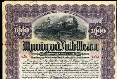 Wyoming. 1906. $1,000. Specimen 1st Mortgage 3-1/2% Gold Coupon bond. Purple border. Speeding locomotive leaving station. VF condition with minor toning and small splits at folds. Red specimen overprints and POC's. Rare and attractive bond. ABNC.
