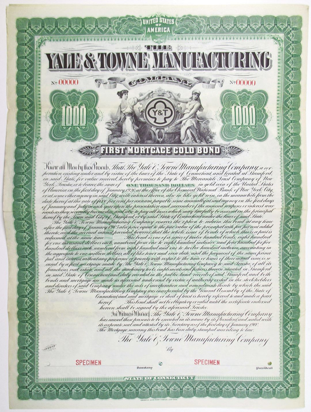 Connecticut, 1900. $1000 Specimen 5% First Mortgage Gold Coupon Bond, Black text with green border and undertint, Company logo at top center flanked by allegorical women. Red specimen overprints, 00000 serial numbers, and POCs. Fine condition, ABNC. Yale & Towne Manufacturing Company was established in 1868 by Linus Yale and Henry Towne in Stamford, Connecticut. Linus Yale was the inventor of the tumbler lock. He died in New York on December 24, 1868, never knowing that his company would become the leading manufacturer of locks in the world. Henry Towne expanded the company from locks to materials handling in 1875. Yale & Towne Manufacturing was the leading employer in the Stamford, Connecticut, area.