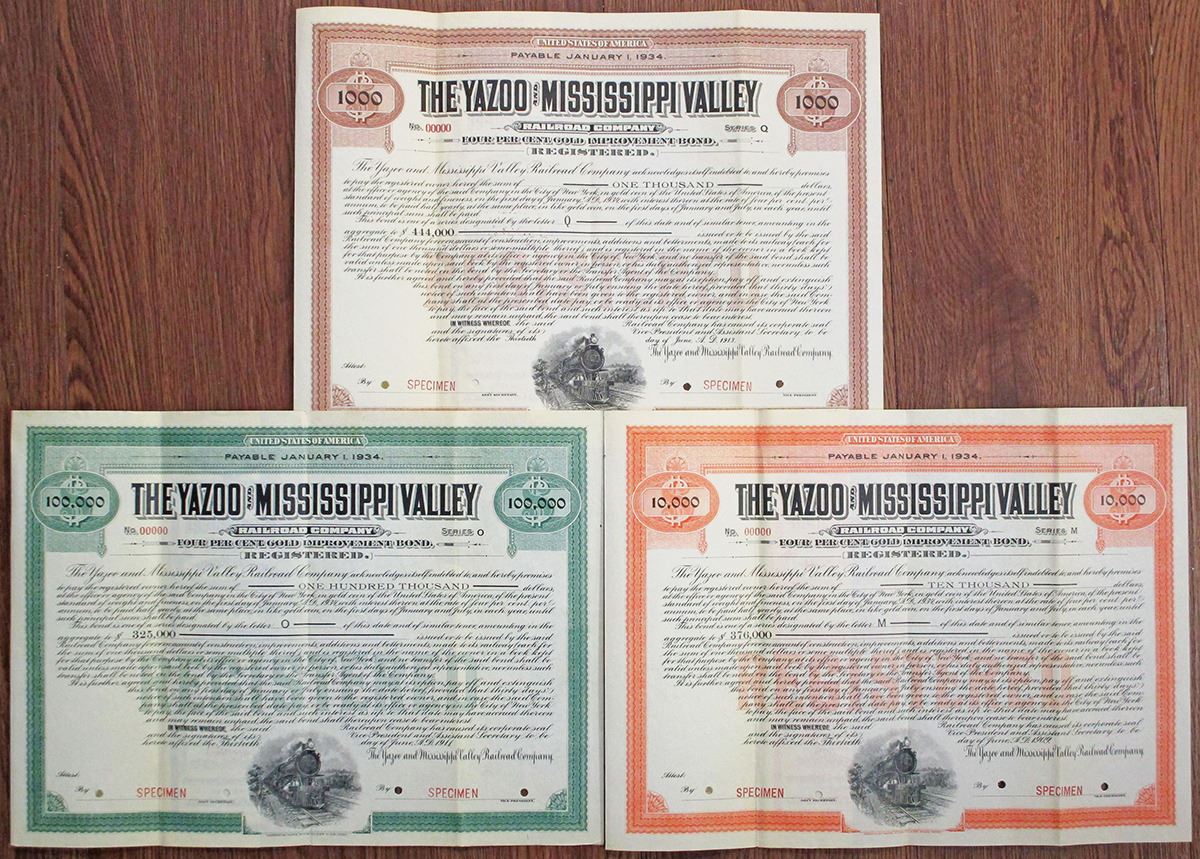 Mississippi. Lot of 3 pieces: Includes 1913, $1000 Specimen 4% Registered Gold Improvement Bond in brown; 1911 $100,000 Specimen 4% Registered Gold Improvement Bond in green; 1909 $10,000 Specimen 4% Registered Gold Improvement Bond in orange. All have red specimen overprints, 00000 serial numbers, POCs, and are in Fine-VF condition. The Green bond is a rare specimen, orange bond is an unlisted series, and brown bond is an unlisted denomination in that series, All are rare with only 2 or 3 examples found of each one.