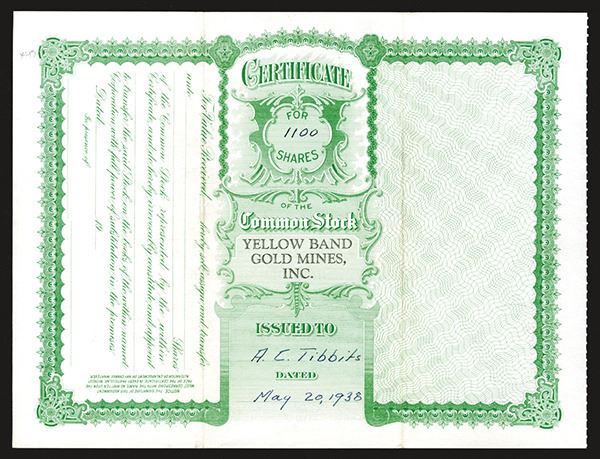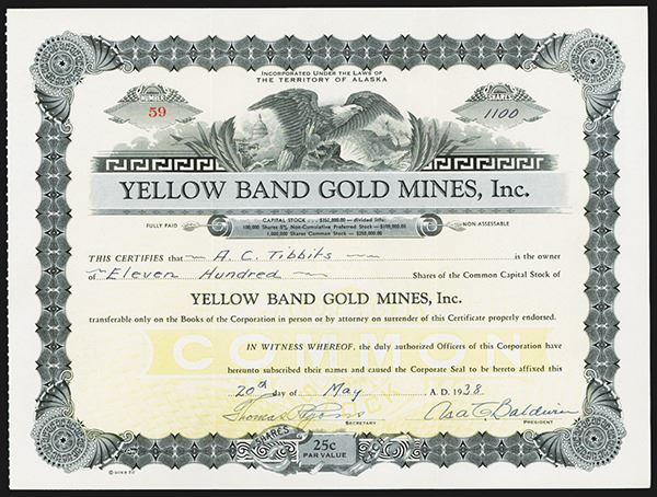 Alaska, 1938. 1100 Shares, issued and uncancelled, Black on light yellow with eagle in middle. XF condition.