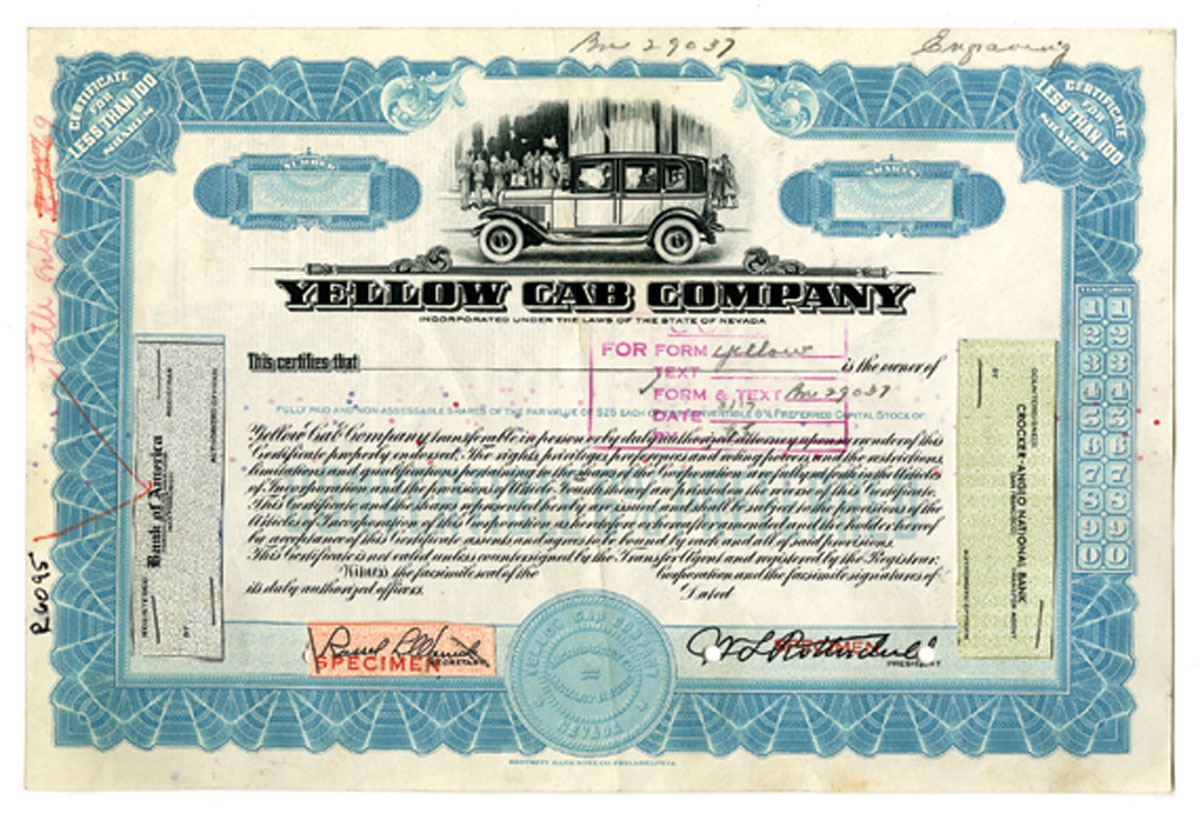 Nevada. Yellow Cab Co., 1920-30, <100 Shares 6% Preferred Specimen Capital Stock Certificate, Black printing on blue border and under print, Early Cab in profile at top in city, Specimen overprints, POC's, and purple production department Order stamp over print, Production Department notes in margins, Signature and banking information changes stapled over old certificate information. VF-XF condition, SBNC. Rare.