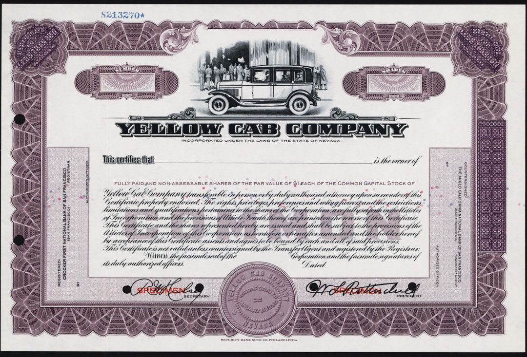 Nevada, ND (1920-30's), Odd Shares (corner overprints were obliterated). Black on brown border and underprint, Yellow cab in middle with people in background, Specimen overprints, POC's, Uncirculated condition, Security BNC.