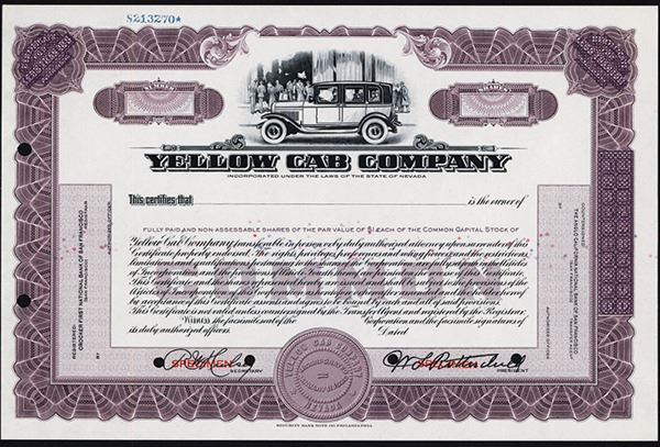 Nevada, ND (1920-30's), Odd Shares (corner overprints were obliterated). Black on brown border and under print, Yellow cab in middle with people in background, Specimen overprints, POC's, Uncirculated condition, Security BNC.