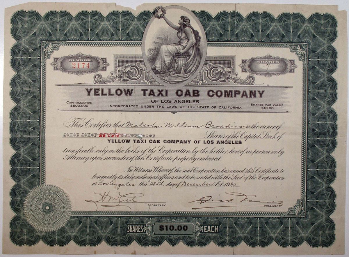 California, 1920. 7 Shares I/U Capital Stock Certificate, Black text with green border, Allegorical woman seated with shield and wreath at top center. Fine condition, with some archivally reinforced folds and minor tears repaired. First time seen by us. (Sold "AS IS", no returns accepted)