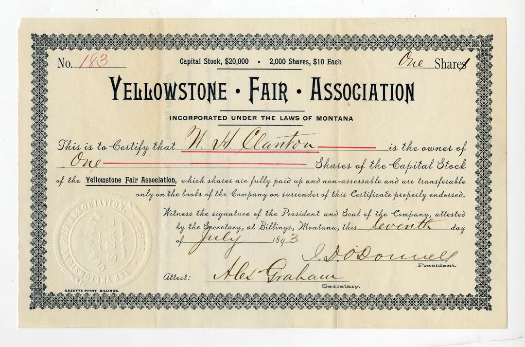 Montana, 1893. 1 Share Capital Stock I/U Certificate, Blue on blue border, Company title at top, S/N 183, VF-XF condition. Donnell founded the Yellowstone Fair Association, where he began an annual ritual of promoting irrigation, scientific agriculture, and the cultivation of alfalfa and sugar beets, which he had successfully cultivated at Hesper Farm, in Montana.