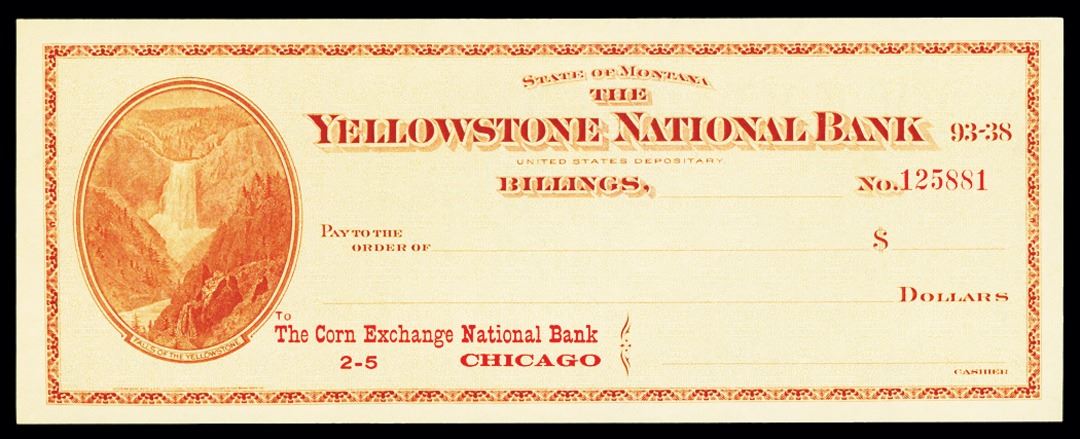 Billings, Montana, ND (ca.1900-1910). Unissued check or draft, brown on yellow paper, "Falls of Yellowstone" vignette on left, Intaglio printed, Uncirculated condition, Rare Yellowstone Park related check. Western BNC-American BNC.
