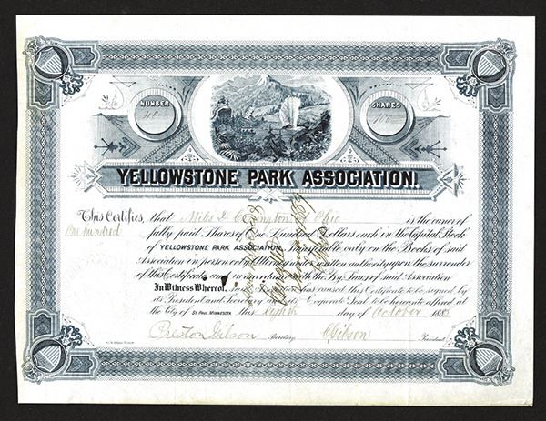 1885. Issued and pen cancelled stock certificate. 100 Shares. Preferred stock. Certificate #40. Black border and title with vignette of "Old Faithful" and mountains. VF condition. Corporate seal has running dear or elk on it. Extremely rare early National Park certificate. Yellowstone National Park, set aside as a national park on March 1, 1872, is located in Idaho, Montana, and Wyoming. It spans an area of 3,472 square miles, comprising lakes, canyons, rivers and mountain ranges. Half of the world's geothermal features are in Yellowstone, fueled by this ongoing volcanism. Rare stage coach and transportation related stock certificate.