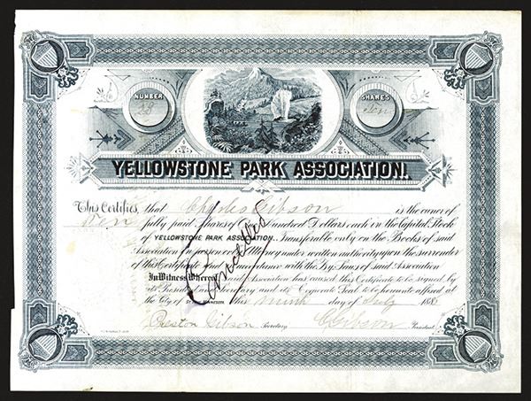 Wyoming & Montana. 10 Shares Issued and cancelled stock certificate, Black with Old Faithful erupting, POC's, XF condition, Rare and early U.S. National Park certificate, home of old Faithful. The Yellowstone Park Association was established in 1886. Charles Gibson, Nelson Thrall, and John Bullitt formed this new company with financial backing from the Northern Pacific RR. They bought out the National Hotel, and assumed control over the Fire hole Hotel and other Yellowstone Park Improvement properties. ITASB Charles Gibson as president,. VF, Rare and attractive stock certificate.