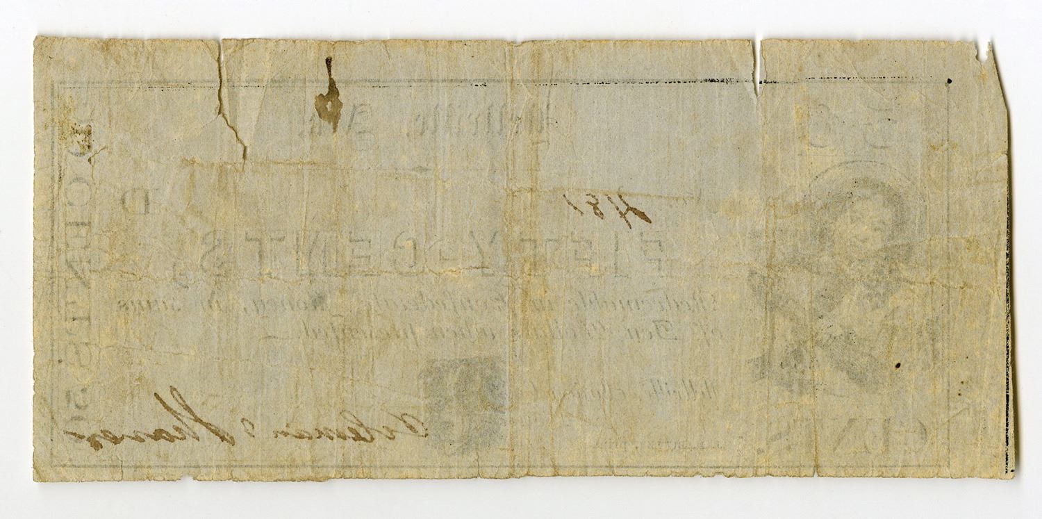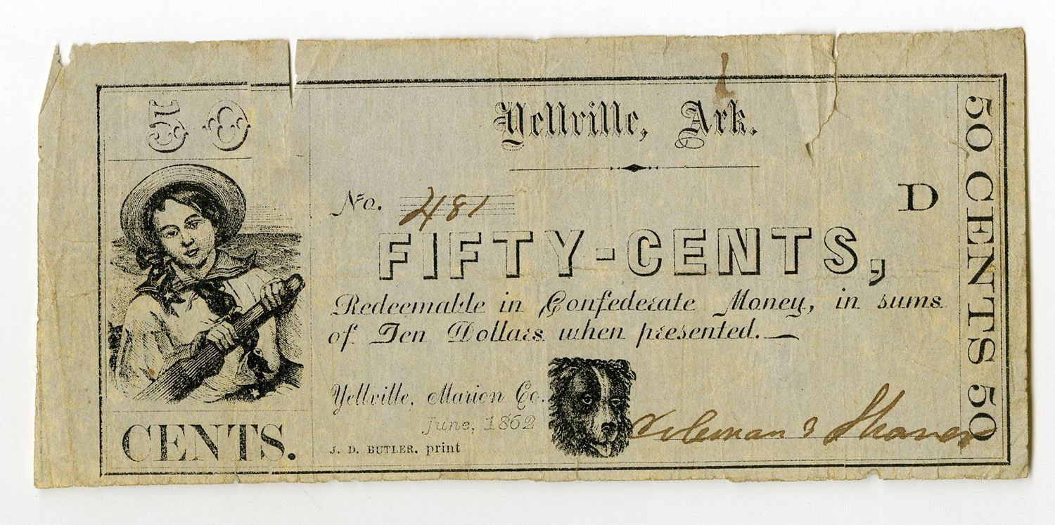 Yellville, Marion County, Arkansas. June, 1862, Coleman & Shaver. 50 Cents, (Rothert 712-2), Issued obsolete scrip note, Dated June 1862, Black text with black border, The small print near the top edge reads "Redeemed at White & Hanley's, Van Buren, and Mayers & Bro., Fort Smith, Ark." Allegorical sailor at left, Dog depicted at center bottom, Signature at bottom right, S/N 481, Fine condition with small 3/4 inch tear on the top right margin. Rarity 7 in Rothert. "J.D. Butler. print.", A $1 denomination of this design was offered in 2017. No examples of the 50 Cents denomination could be found having been at auction previously.