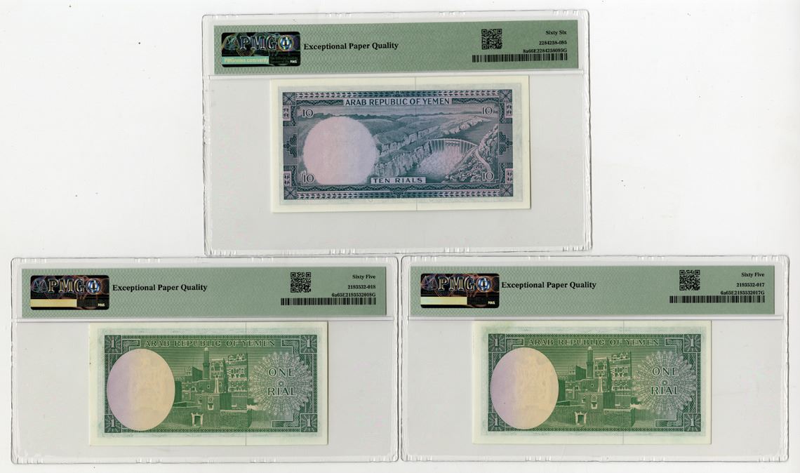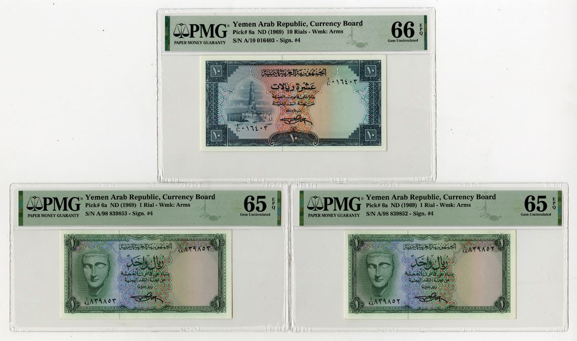 Yemen, ND (1969). Lot of 3 Issued Banknotes, Includes 1 Rials, P-6a, Sequential Pair, Green on m/c underprint, Alabaster head at left, Back is green with houses in Sana'a with minaret at center, S/N A/98 839852 & S/N A/98 839853, Both are PMG graded Gem Uncirculated 65 EPQ; 10 Rials, P-8a, Blue on m/c underprint with minaret at left, Back is blue on pink with dam at center, S/N A/10 016403, PMG graded Gem Uncirculated 65 EPQ. (3). Sold "AS IS" no returns accepted.