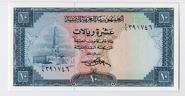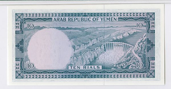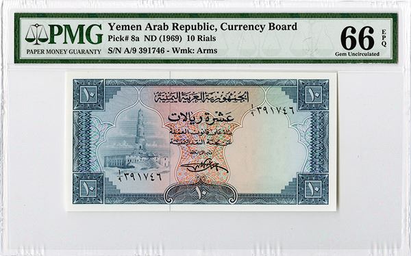 Yemen, issued 10 Rials, P-8a, PMG graded Gem Uncirculated 66 EPQ.