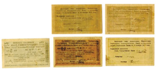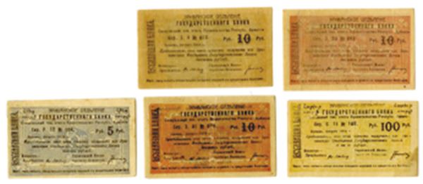 City of Yerevan, Armenia, lot includes 5 Rubles, 10 Rubles (3 pieces, all diff colors), and 100 Rubles. Generally Fine to Very Fine.