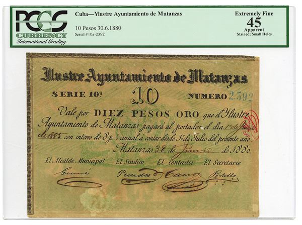 Matanzas, Cuba, June 30, 1880, 10 Pesos Oro, P-Unlisted, Issued, Black on light tan and green underprint with small train and arms, back with circular overprint "10 Bonos", S/N 10a - 2392, PCGC graded Extremely Fine 45 Apparent with note of small worm holes and light stains, rare Cuban circulating bond. First time seen by cataloger.