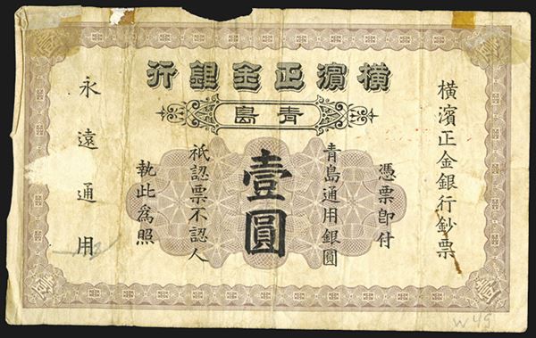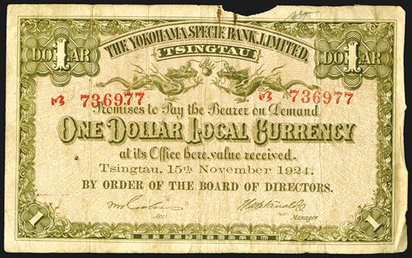 China, $1 Local Currency, P-S757, S/M#H31-150, Issued Banknote, Black and violet, Western Serial numbers, Choice VG to Fine condition with a 15mm by 2mm piece missing from the top middle margin, the back had some tape from previous mounting, Rare note in any condition and a difficult branch issue which is unpriced in SCWPM.