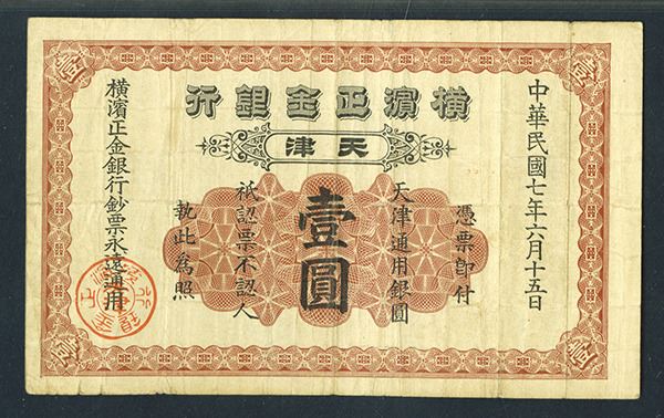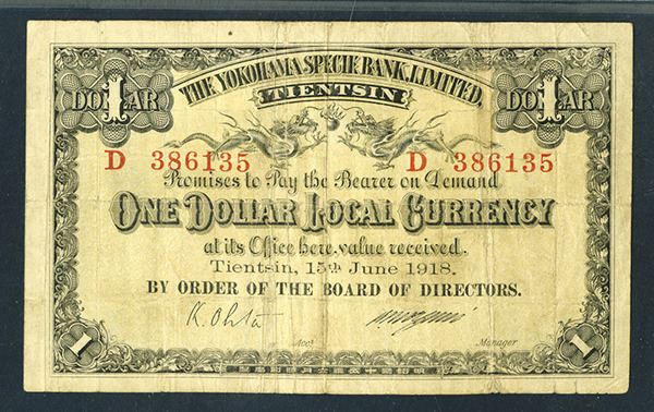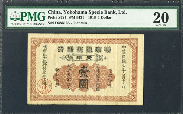 Tientsin, China, 1918, $1, P-S721 (S/M #H31-), Issued banknote, Brown and black, S/N D386135, PMG graded Very Fine 20. Scarce note in higher grades.