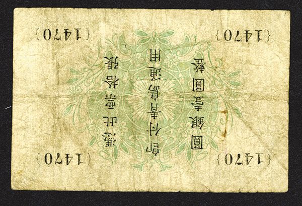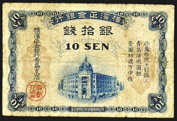 Quindao, China, 10 Sen, Pick S750b. Issued banknote, Block 1470 used during the Agency period, Only authorized to be issued and used in Qingdao. VF with small pinholes. (ex Ruth W. Hill Collection).