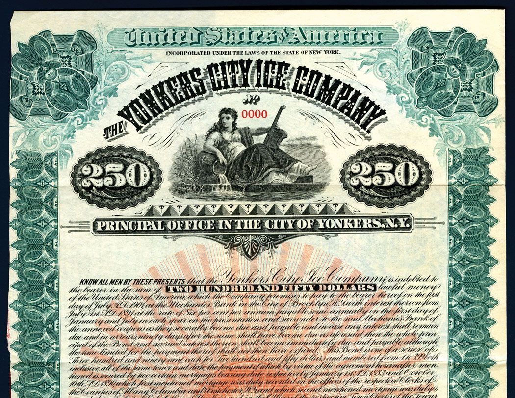 Yonkers, NY, 1891, $250, 6% Bond, S/N 0000, Black on green border with red underprint, attractive design, appears XF but slightly cut into the left margin, POC's. HLBNC.