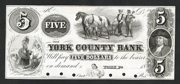 York, PA. 18xx (ca.1840-50's), $5, Proof printed on india paper, Farmers plowing top Penn at right and dog with young man and woman on lower left, POC's, Light pencil notation on back, no ABN imprint on back, Choice to Gem Uncirculated, Draper & Co., Scarce proof.