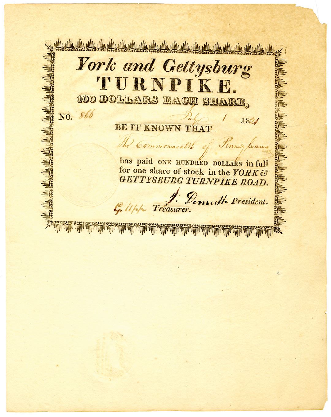 Pennsylvania, 1821. One Share I/U Stock Certificate, S/N 866, Black text with black border, Embossed company seal at bottom left corner. Fine-VF condition, missing both right corners. The York and Gettysburg Turnpike was completed in 1819, and served as a link to connect Chambersburg to Philadelphia via turnpike.