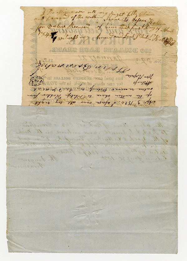 Pennsylvania, 1 Share, Issued and uncancelled, Black with ornate border, S/N 823, Fine with toning, ink bleed from back and attached to a stock transfer lightly on the bottom margin. Scarce turnpike certificate.