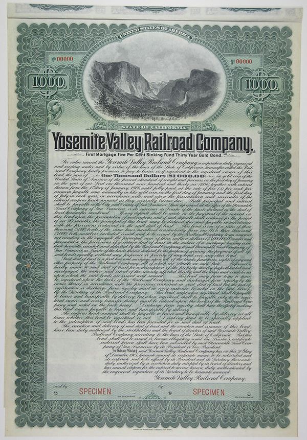 California. $1000, Green border. Scenic view of Yosemite Valley. XF condition. Red specimen overprints, POC's and "00000" serial numbers. Vignette of Falls, valley and mountains. Coupons attached. Rare certificate. Unlisted in Cox.
