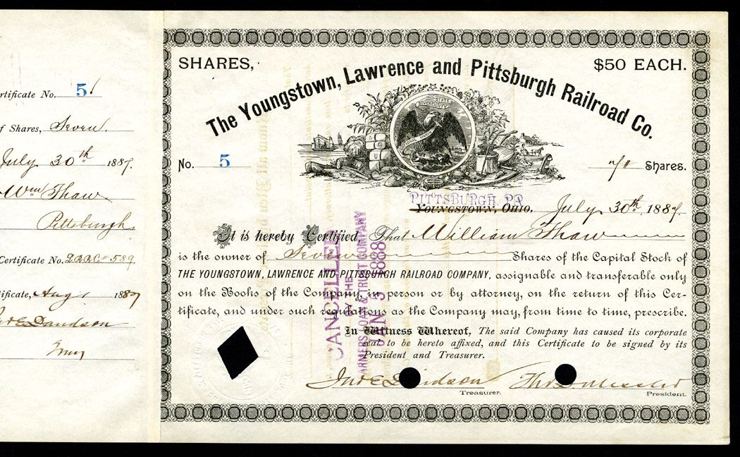 PA, 1887 Certificate # 5, 7 Shares of Youngstown, Lawrence and Pittsburgh Railroad Co., Issued and Punch Hole Cancelled Stock Certificate. VF
