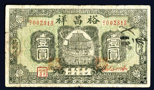 1 Yuan, P-Unlisted, Issued banknote, Gray-green on light green, S/N O 002818, Choice Fine condition.