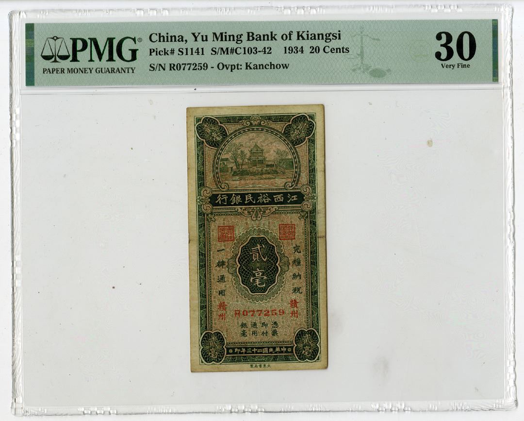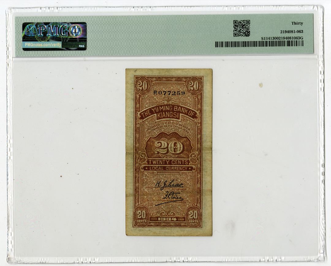 Kanchow, China, 1934. 20 Cents, P-S1141 S/M#C103-42, Issued banknote, Dark green on m/c underprint with Temple at top, Back is brown, S/N R077259, Ovpt: Kanchow, PMG graded Very Fine 30. Only 4 examples have been graded in the PMG census with this example being the 2nd one to be offered at auction in the Track and Price Census.