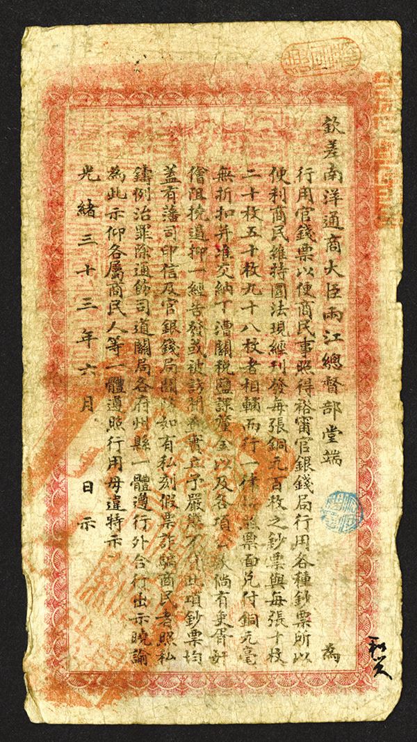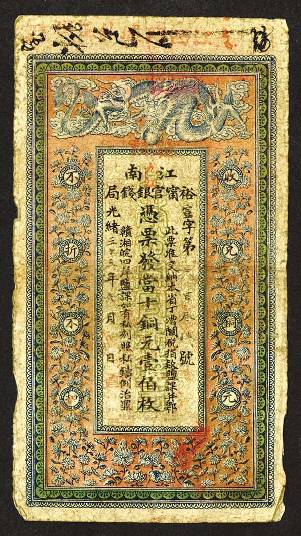 China, 100 Coppers, P-S1175a, S/M# C107-22a, Issued banknote. Dragon at top, Black with light green and red undertint, back with black text, red border and large red seals, Fine condition. (Ex-Pogrebetsky Family Archives)