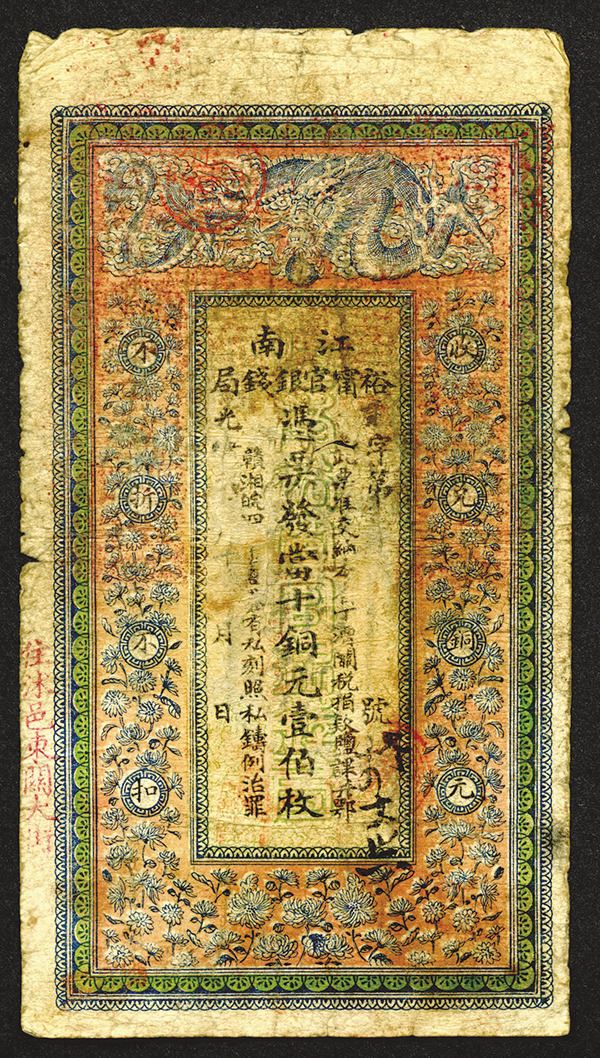 China, 100 Coppers, P-S1175a, S/M# C107-22a, Issued banknote. Dragon at top, Fine condition with a small hole in the middle.