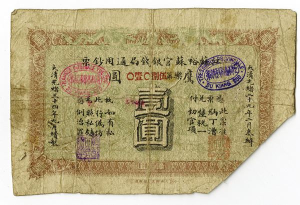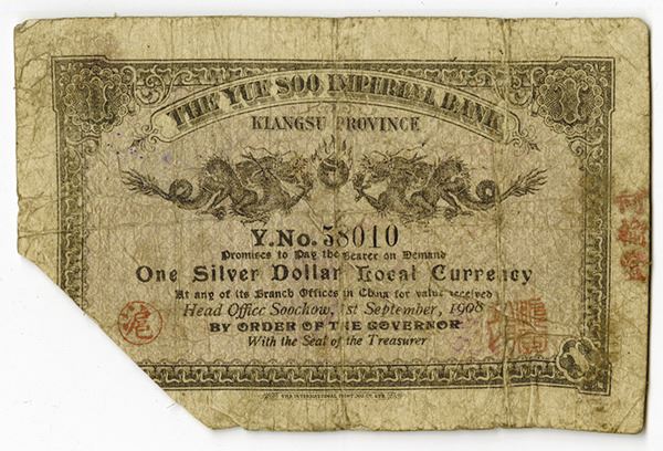 Soochow, Kiangsu Province, China. 1908, 1 Silver Dollar Local Currency, P-S1232b, S/M#C122-10, Issued banknote, Lower right corner clipped, Brown with green underprint, back with facing dragons, S/N: Y No.58010, Choice VG to Fine condition, Rare note in any form. IPCL.