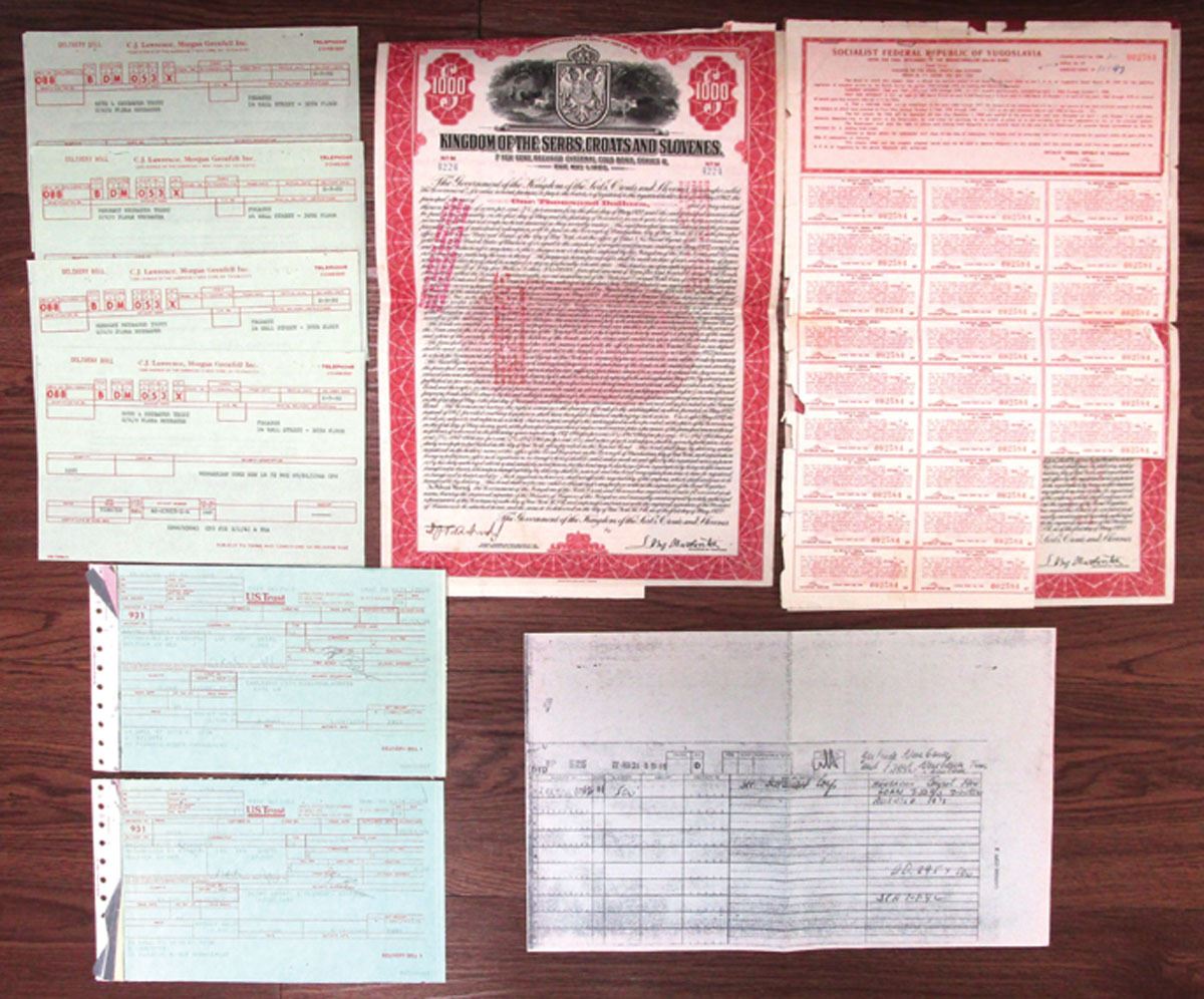 Yugoslavia, 1922-90. Lot of 8 Items, Includes: 1922, $1000, Kingdom of the Serbs, Croats and Slavenes Gold Coupon Bonds (2); Socialist Federal Republic of Yugoslavia $1000 I/C 7% Pair of Coupon Bonds, 1922; U.S. Trust Pair of Delivery Bills from 1988 regarding purchases of stocks from Yugoslavia and Czechoslovakia; C. J. Lawrence, Morgan Grenfell Inc., Group of Four Delivery Bills for Hungarian Coins dated 1990. Documents range from Fine to VF+ condition. (8). Sold "AS IS" no returns accepted.