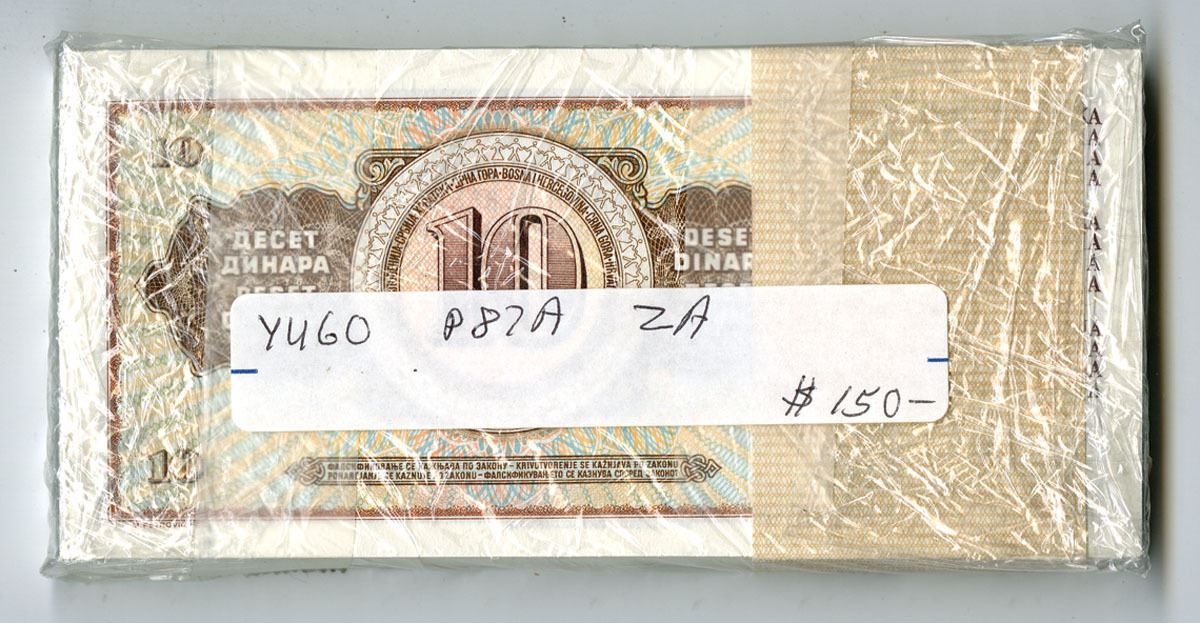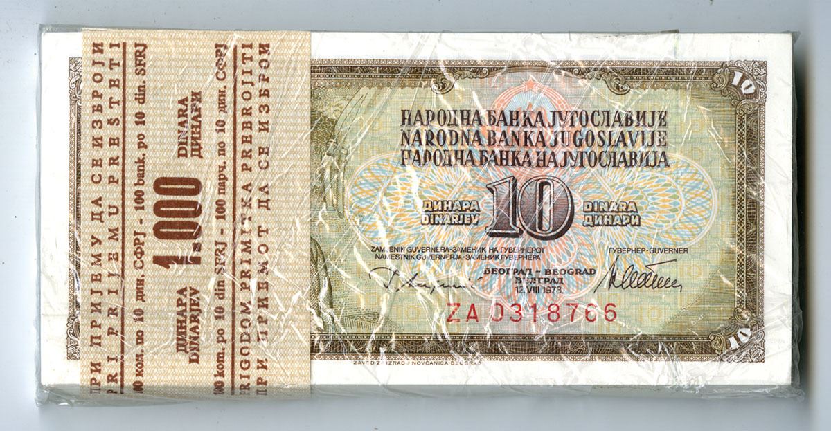 Yugoslavia, 1978. 10 Dinara, P-87a, Sealed Package of 100 Banknotes, Dark brown on m/c underprint with male steelworker at right, Back is brown on m/c with large numeral of value at left, Sealed in original packaging and plastic wrapping. UNC to Gem UNC condition.