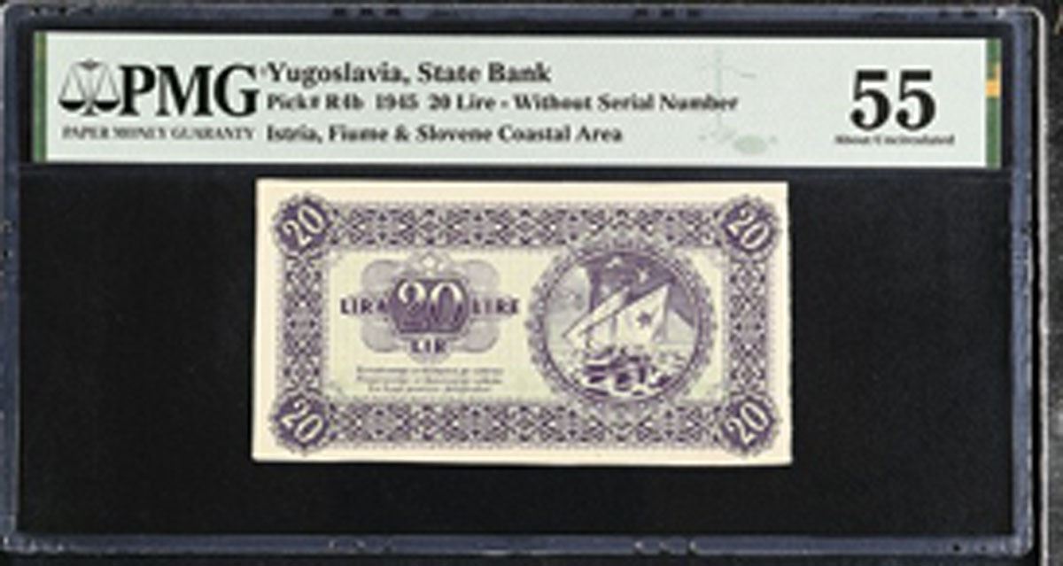 Yugoslavia, 1946. 20 Lire, P-R4b, Issued Banknote, Purple on light green underprint with sail boat at right, Back is purple and green with bank name at right in three languages and denomination at left, PMG graded About Uncirculated 55. Only 4 are graded in PMG census.