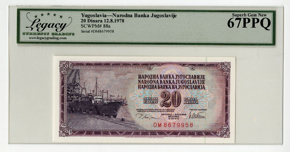 Yugoslavia. 1978. 20 Dinar, P-88a, Issued Banknote, Purple on m/c underprint with ship at left, S/N DM8679958, LCG graded Superb Gem New 67PPQ
