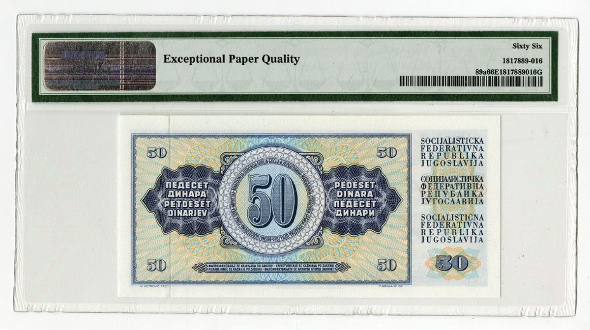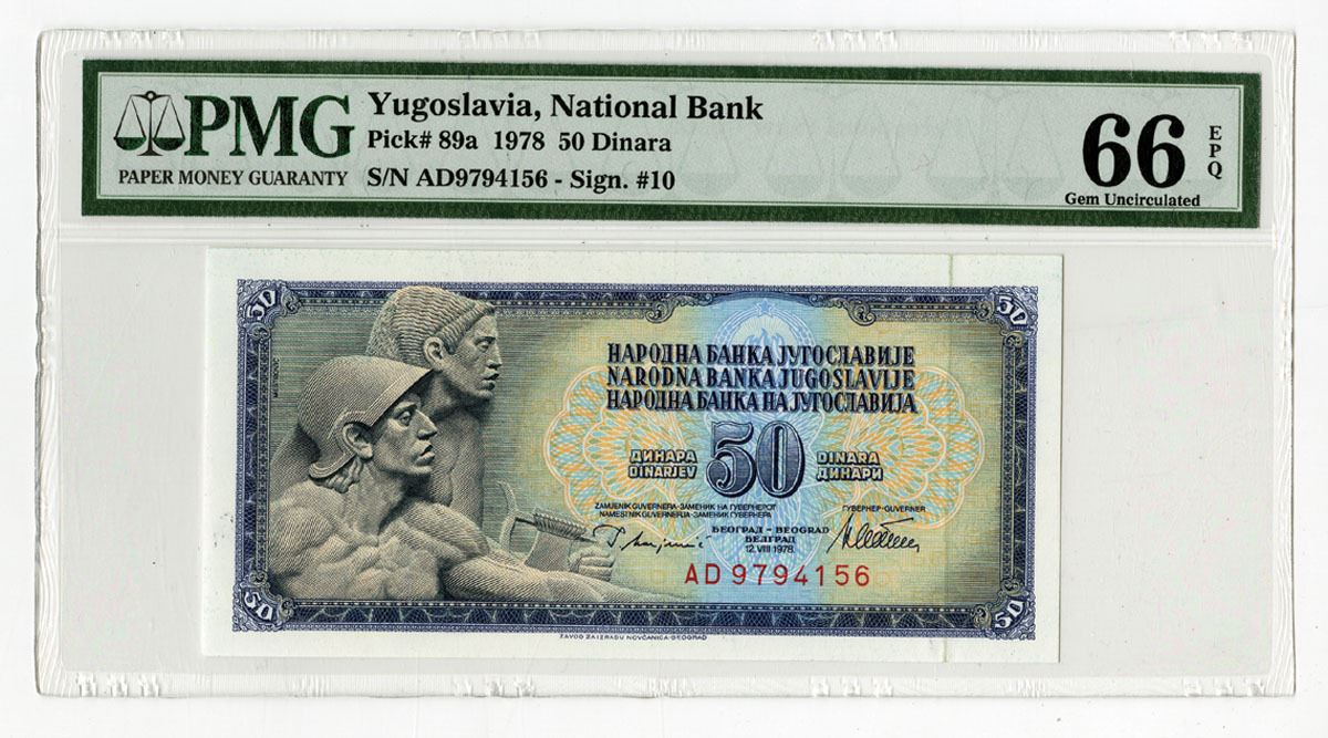 Yugoslavia, 1978. 50 Dinara, P-89a, Issued Banknote, Blue on yellow and m/c underprint with frieze of men at left, S/N AD9794156, PMG graded Gem Uncirculated 66 EPQ.