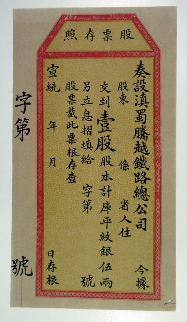 China. A blank stub of the Tengyue Railway Co. stock certificate, with the amount of 5 Taels of silver, printed around 1910. The stock holder's name and address are left blank._______________________