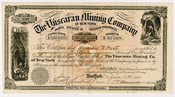 Yuscaran, Honduras (Inc. in New York). Mine located in Honduras. 15 Shares Capital Stock I/U Stock Certificate, Black print on red/brown under tint, Image of mine shaft to left and man clearing rubble to right, VF-XF condition. Mines located in Yuscaran Honduras, C.A.
