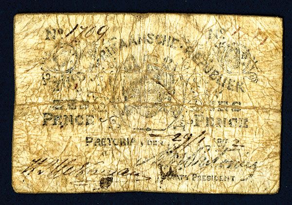 Pretoria, South Africa, 29 January 1872, 6 Pence, parchment money, P-43, Issued banknote with unlisted date, Black on parchment type of paper, 72mm by 48 mm, hand-signed at left, serial #1709, hand-signed “Williams”? at left, engraved signature of Pretorius, President of the State. Pick lists this Shilling with the date 13.4.1872 and illustrates a sixpence of this rare and interesting currency. Choice Good to VG but really VG+ for issue which is difficult to find in legible condition, Extremely rare. (Purchased from South Africa's leading collector, the late Jimmie Lawrence, in September of 1990.)
