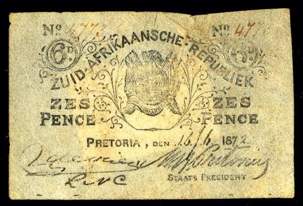 Pretoria, South Africa, 16th April 1872, 6 pence, parchment money, Zes-Pence, P-43, Issued banknote with unlisted date, Black on parchment type of paper, 72mm by 48 mm, hand-signed at left, serial #4773, engraved signature of Pretorius, President of the State. VF to almost XF, not washed and with no sign of shrinkage. Extremely rare.