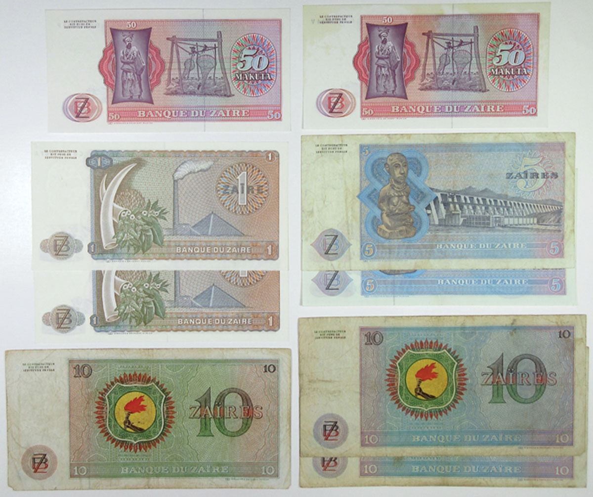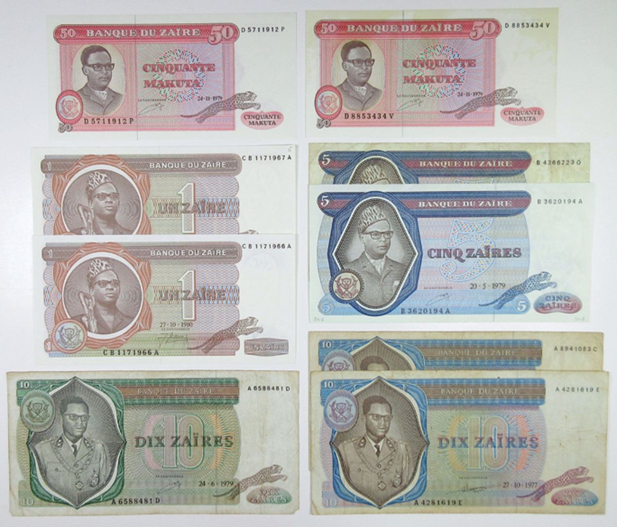 Zaire. Includes 50 Makuta, 1979, P-17a (2 pcs, AU); 1 Zaire, 1981, P-19b (2 pcs, AU); 5 Zaires, 1979, P-22a (2 pcs, F-VF); 10 Zaires, 1976, P-23a, Fine; 10 Zaires, 1977, P-23b, Fine; and 10 Zaires, 1979, P-24a, F-VF. 9 pieces.