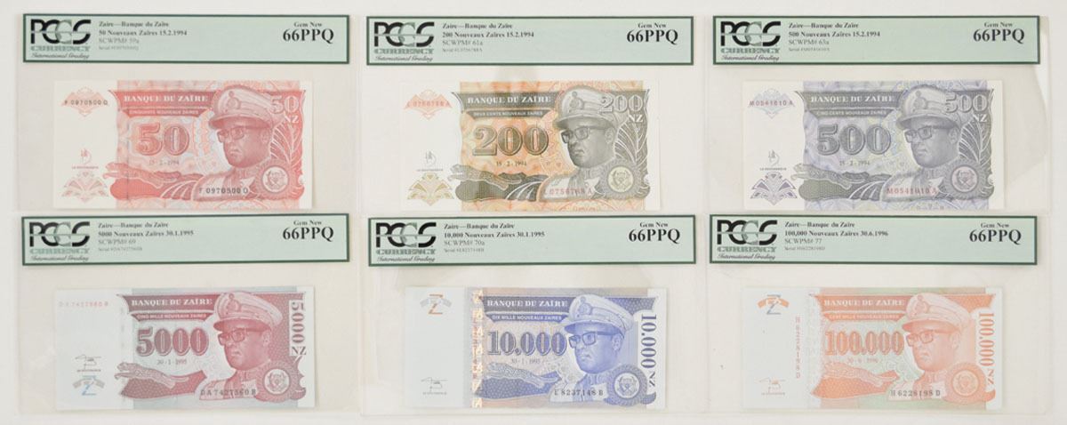 Zaire, 1994-96. Lot of 6 Issued Banknotes, Includes: 1994, 50 Nouveaux Zaires, P-59a, PCGS graded Gem New 66 PPQ; 1994, 200 Nouveaux Zaires, P-61a, PCGS graded Gem New 66 PPQ; 1994, 500 Nouveaux Zaires, P-63a, PCGS graded Gem New 66 PPQ; 1995, 5000 Nouveaux Zaires, P-69, PCGS graded Gem New 66 PPQ; 1995, 10,000 Nouveaux Zaires, P-70a, PCGS graded Gem New 66 PPQ; 1996, 100,000 Nouveaux Zaires, P-77, PCGS graded Gem New 66 PPQ. Notes are in different colors but all have portrait of Mobutu at left on obverse and denominations on reverse. (6). Sold "AS IS" no returns accepted.