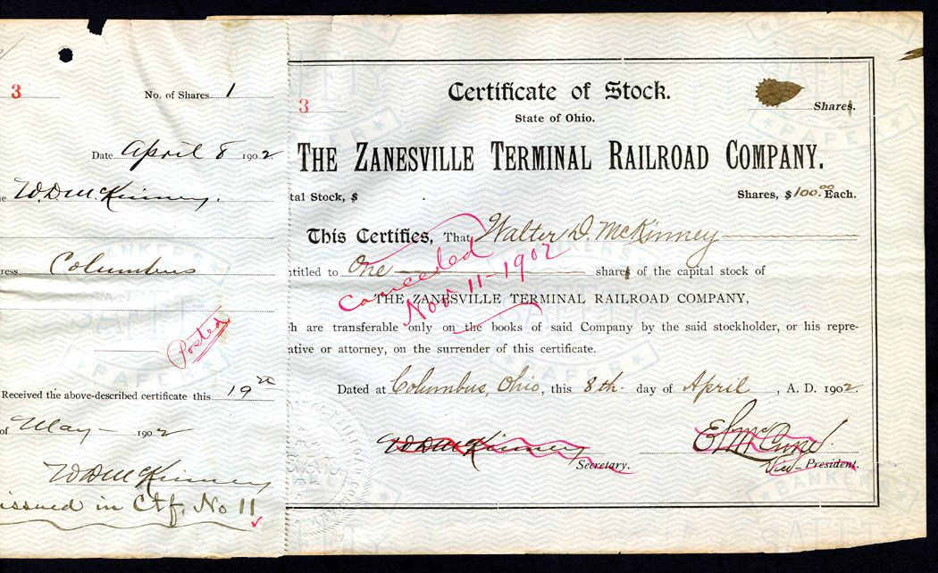 OH, 1902, certificate # 3, 1 Share of Zanesville Terminal Railroad Co., Issued and Punch Hole Cancelled Stock Certificate. VF
