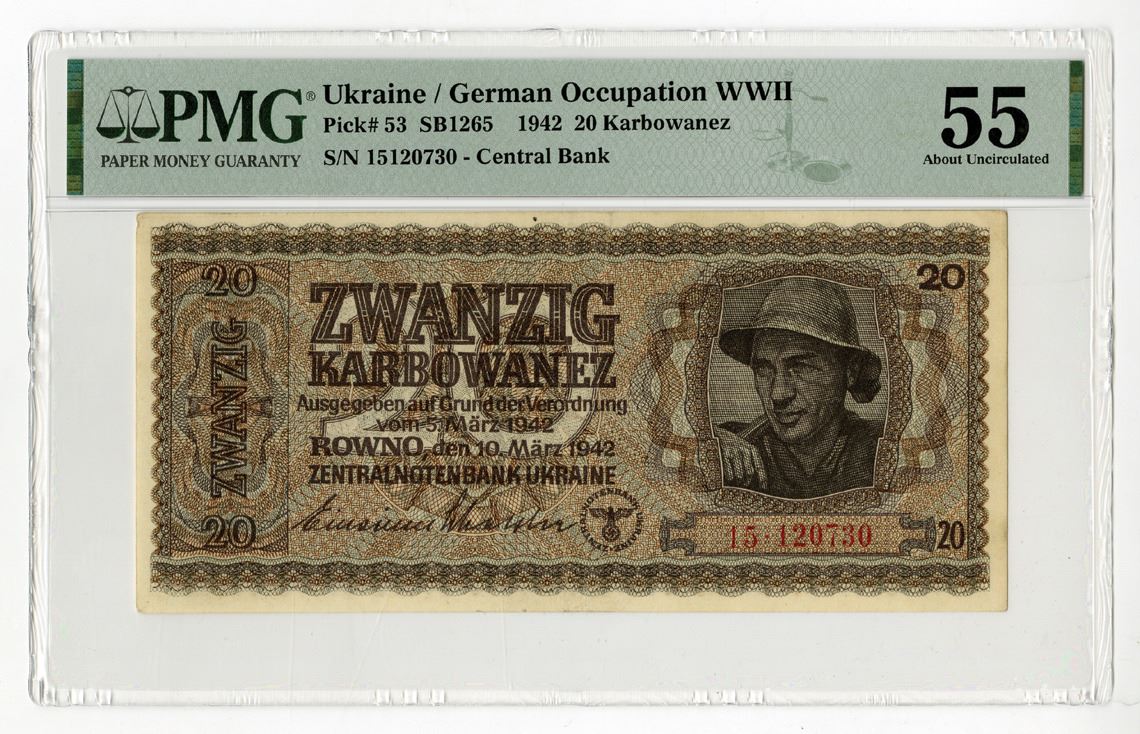 Ukraine/German Occupation, 1942. 20 Karbowanez, P-53, SB1265, Issued banknote, Gray-brown printing with soldier at right, Back is gray brown with denomination at center, S/N 15120730, PMG graded About Uncirculated 55.
