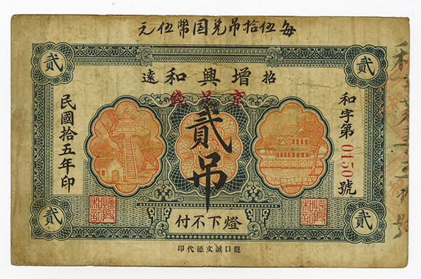 Shandong Province, China. A local banknote issued by a private bank Zengxinghe in Zhaoyuan County, Shandong Province in 1926. Delicately printed. The main images on the front side are oriental pavilions. The denomination is shown in the center, and the serial number is block "He" number 0150. The text on the left side shows the date, and the texts on the bottom are "no payment in the evening" and the name of the printer. The hand-written text on top is "every 50 strings could be exchanged to 5 yuan". The back side shows an oriental garden, with text on top describes the address of the bank, and text on the bottom saying "unnamed note". __________________1926_____________________________________0150_____Ò____Ó________________Ò_________Ó___________________Ò_____Ó___