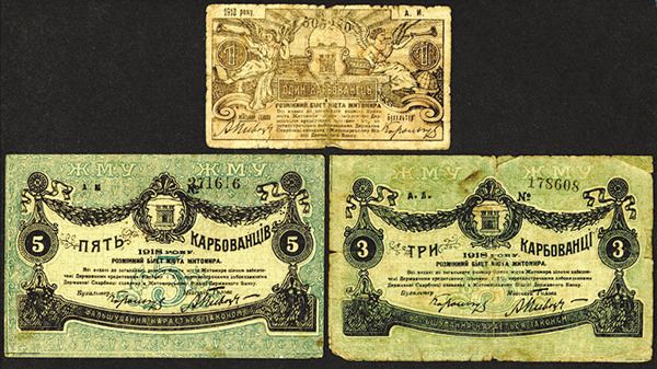 Ukraine. 1, 3, 5 Karbovantsiv. SCWPM Russia S341, S342, S343a. City arms at center. Good to Very Good, the first two with paper separation. 3 pieces.