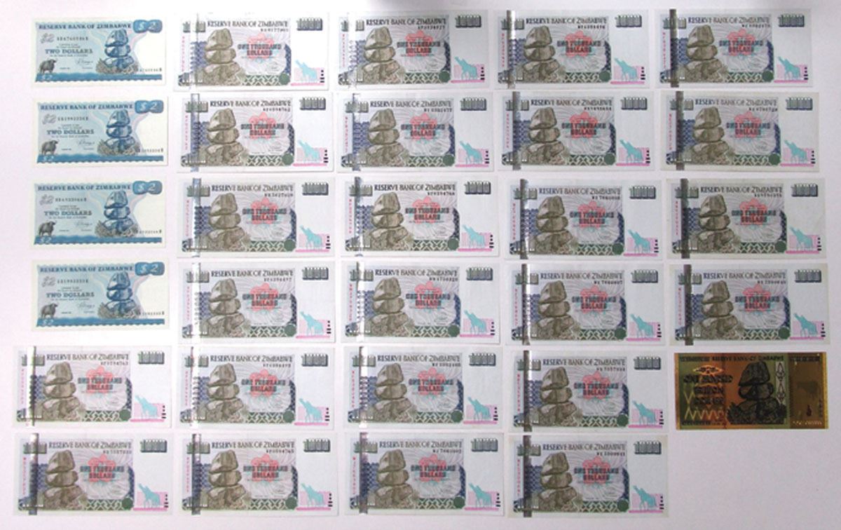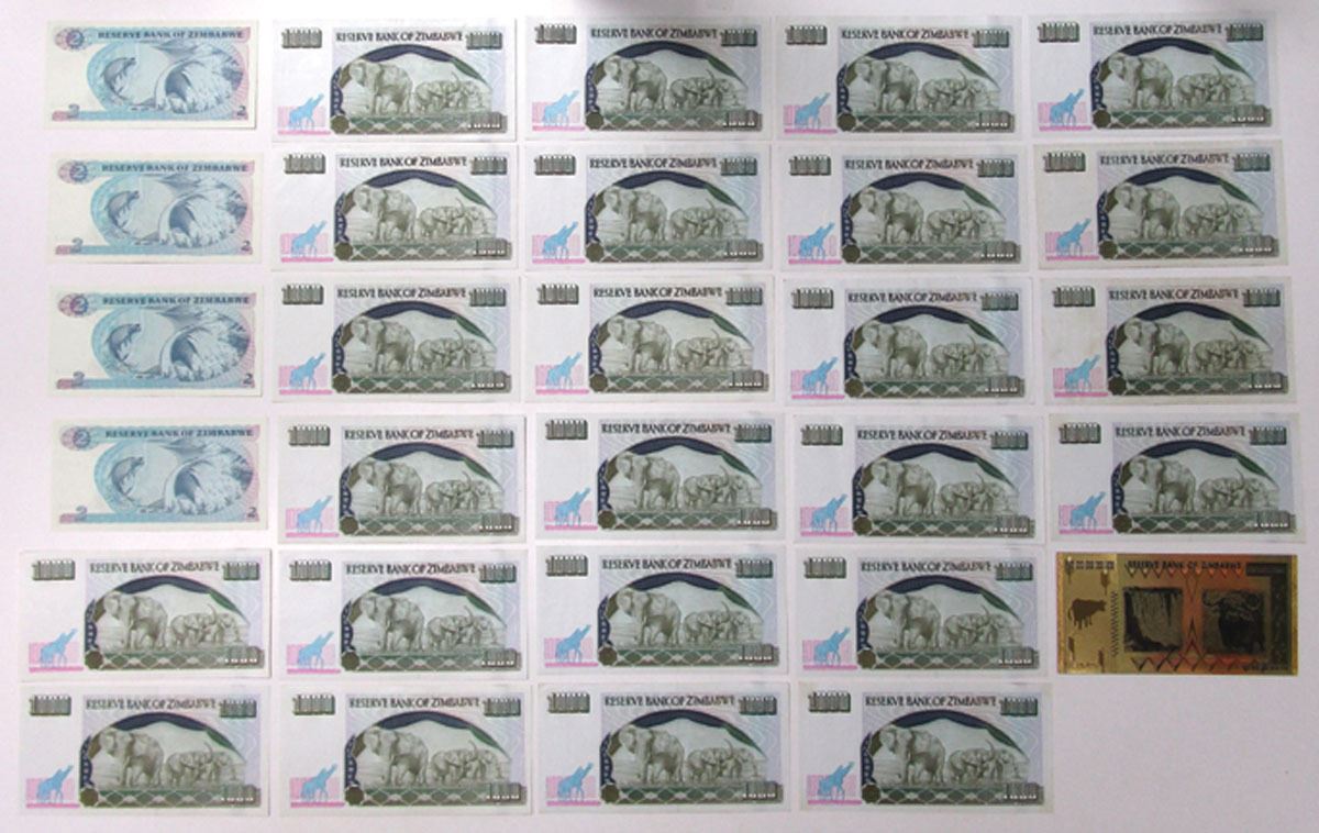 Zimbabwe...., 1983 to 2003. Lot of 26 Issued Banknotes, Includes: 1983, 2 Dollars, P-1b (4); 2003, 1000 Dollars, P-12a (24); 2008, 100 Trillion Dollars, P-91 Gold Plated Banknote. Notes range from VF to UNC condition. (26). Sold "AS IS" no returns accepted.