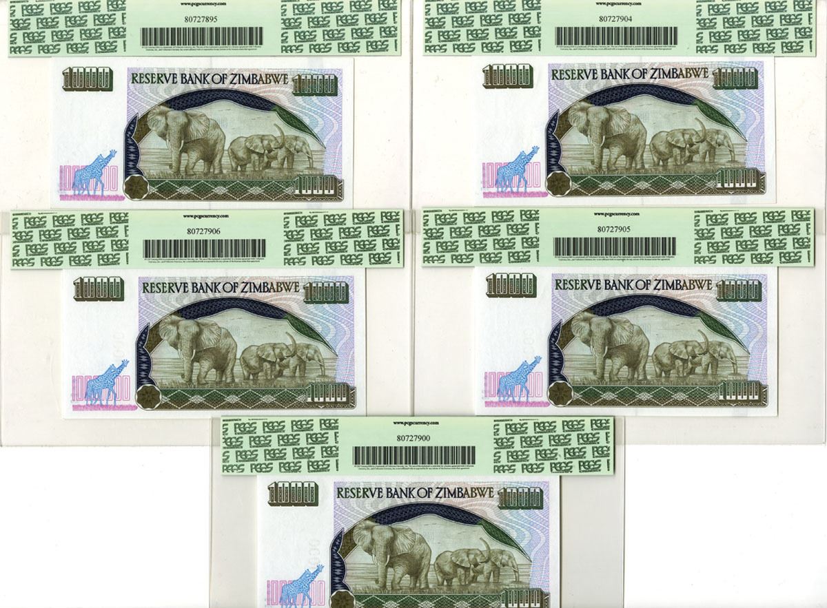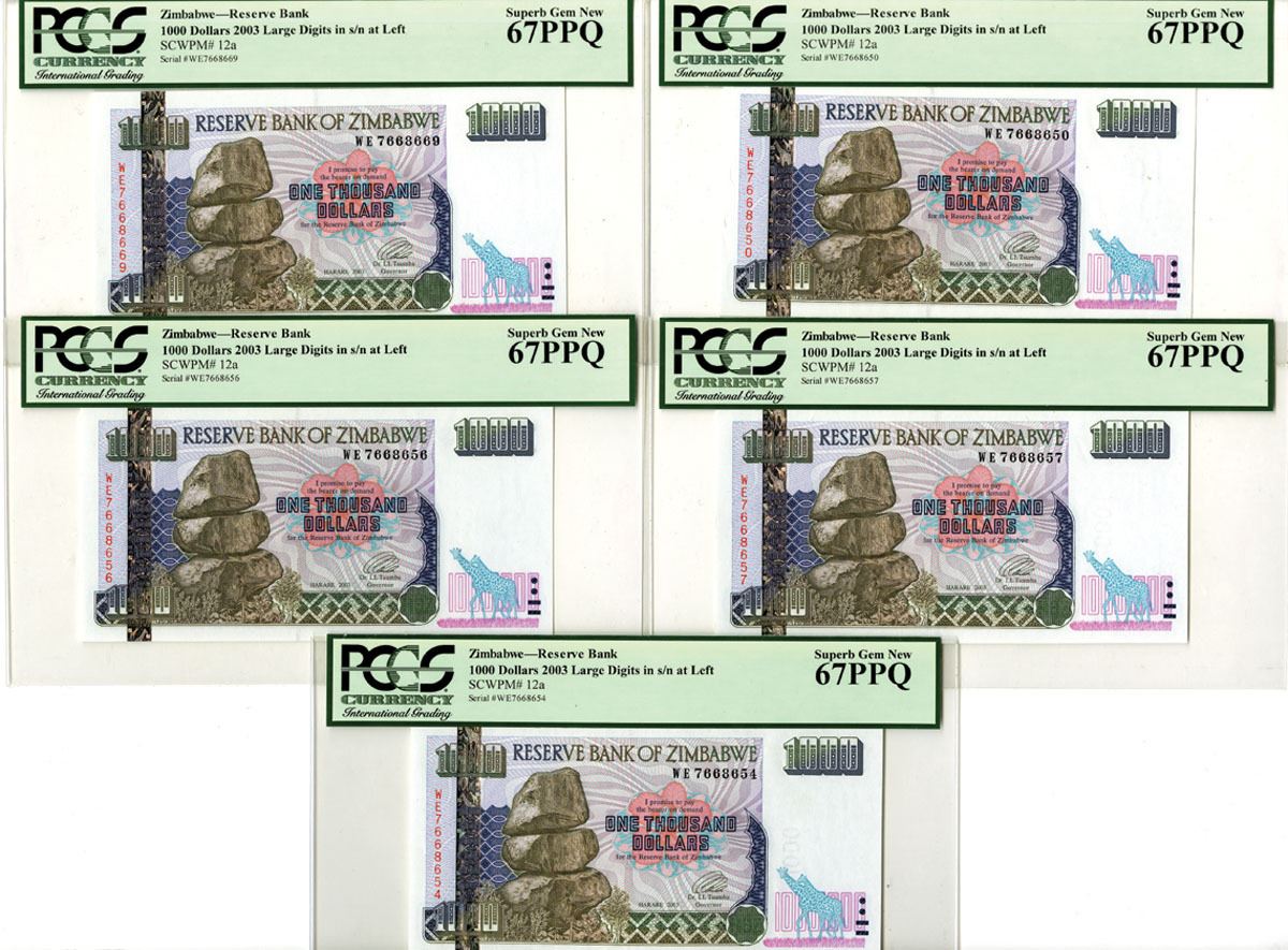 Zimbabwe, 2003. 1000 Dollars, P-12a (5), Issued Banknote Trio, Brown with purple and green on m/c underprint, Chiremba balancing rock formation at left and giraffes at right, Back is m/c with herd of elephants, Notes are all PCGS graded Superb Gem New 67PPQ. (5). Sold "AS IS" no returns accepted.