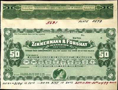 NY. 19--, ca.1900-1910. $50 Proof Traveler's Check printed in green on white paper and mounted on canvas type of paper. . Vignette of allegorical woman on bottom with ornate title on top and currency exchange rates with different countries around the world in middle. No cancellation marks. Rare traveler's check. Note appears in Unc. condition. Republic BNC.