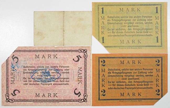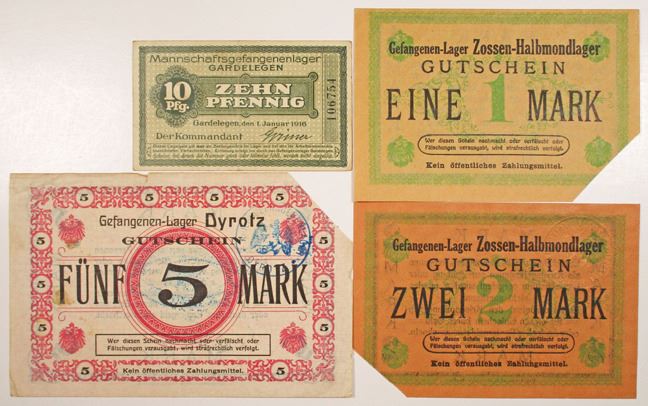 Germany. 1916-18. 4 Issued P.O.W. Notgeld. Halbmondlager Prison Camp: 1 Mark and 2 Mark; Gardelegen Prison Camp, 10 Pfennig; and, Dyrotz Prison Camp, 5 Mark. All are in VF condition. (4)